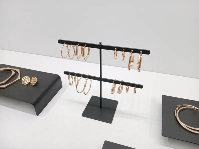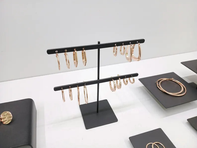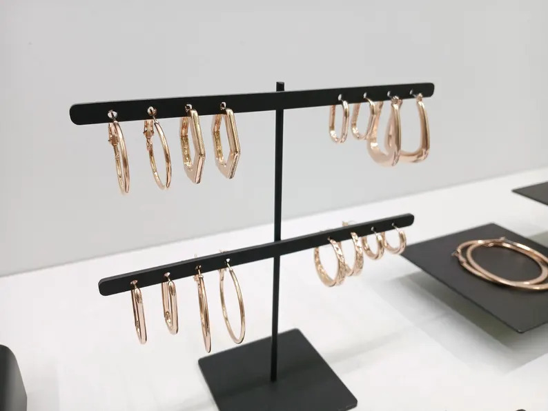 • طراحی T شکل با دو میله‌ی افقی: ساختار دو طبقه امکان نمایش منظم جفت‌های گوشواره در اندازه‌ها و مدل‌های مختلف (حلقه‌ای، آویز و میخی) را در یک فضای عمودی بهینه فراهم می‌کند.