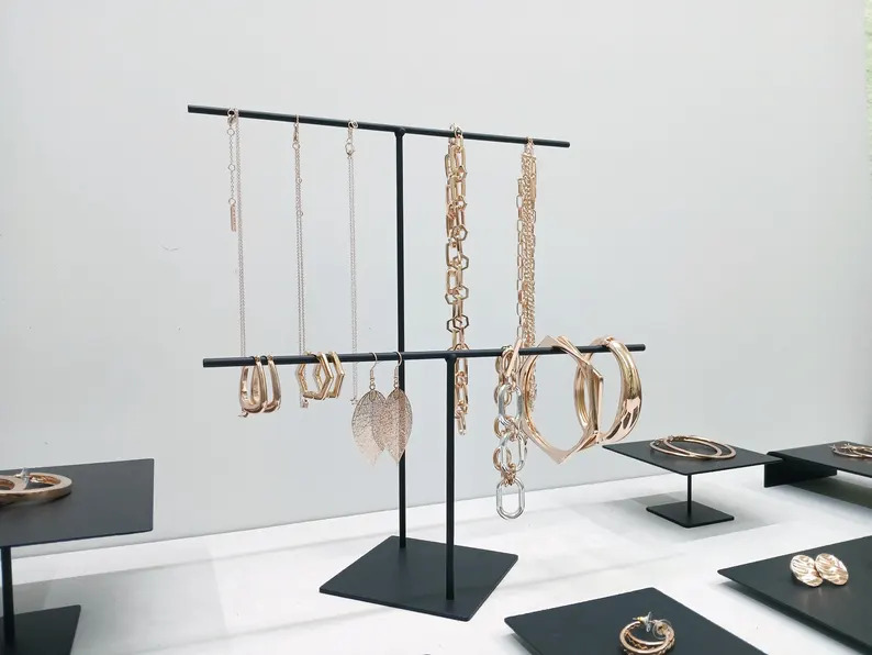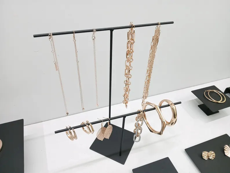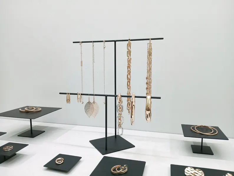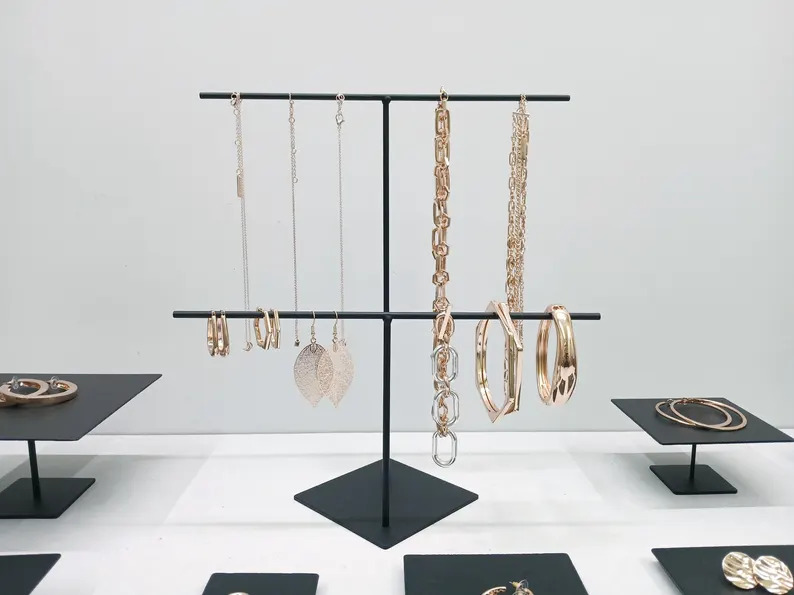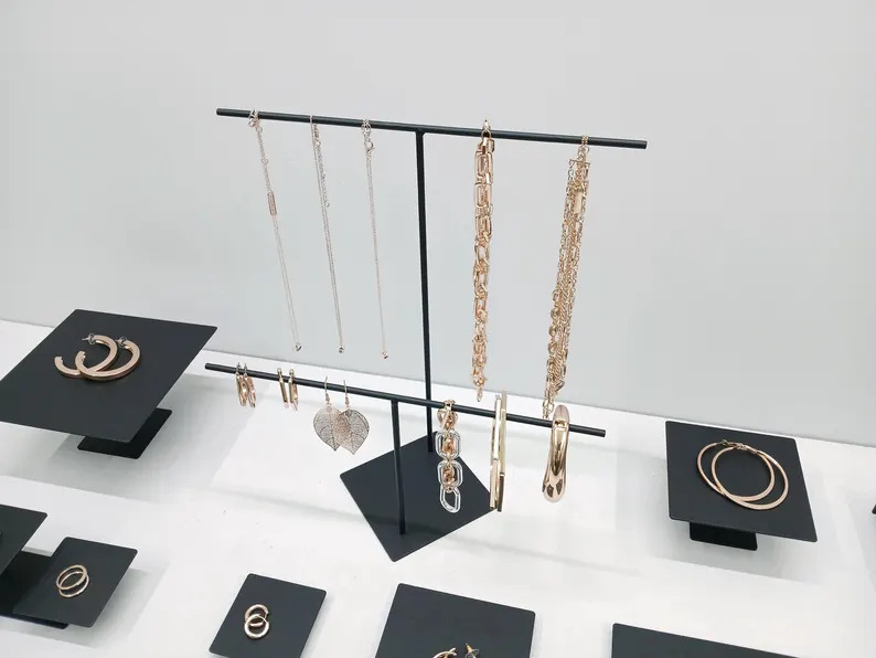 - نحوه استفاده: میلههای استند به دلیل فرم خود، امکان نمایش آویز، گردنبند، دستبند و حتی انواع گوشوارههای میخی و حلقهای را فراهم میآورند.