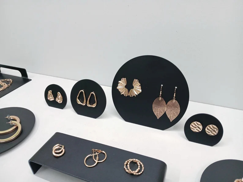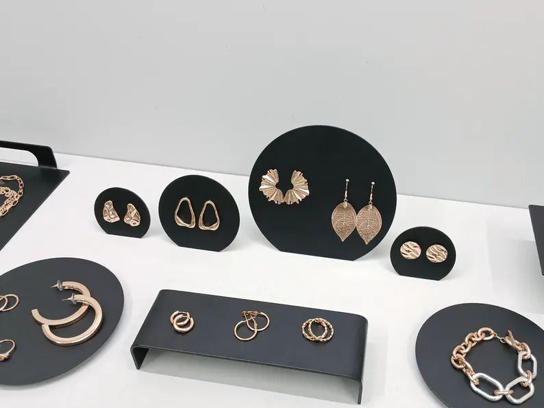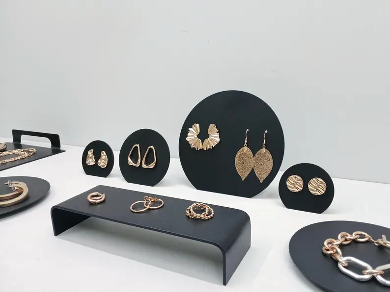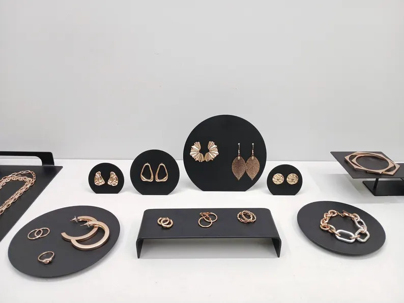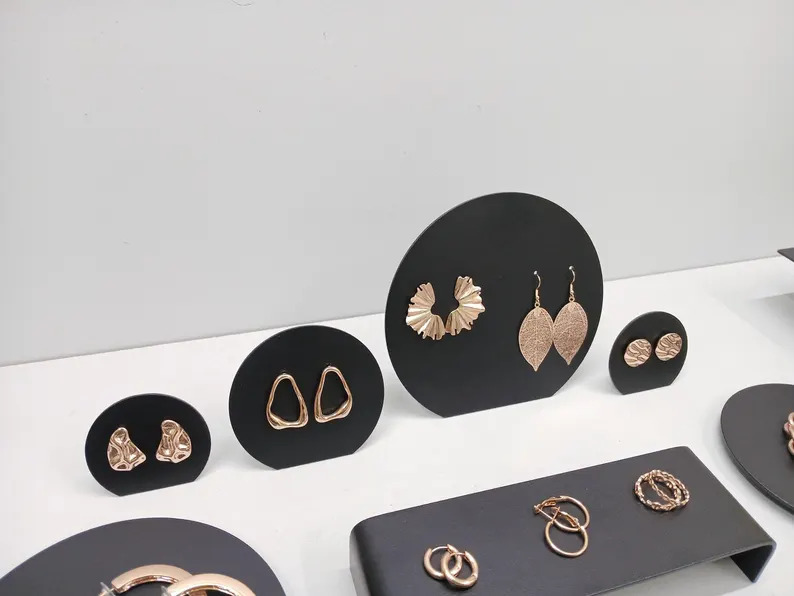 این استندها با رنگ مشکی مات عمیق و طراحی هندسی ساده، یک کنتراست فوق‌العاده با درخشش طلای شما ایجاد می‌کنند و تمام توجه مشتری را به سمت جزئیات ظریف جواهرات معطوف می‌سازند.