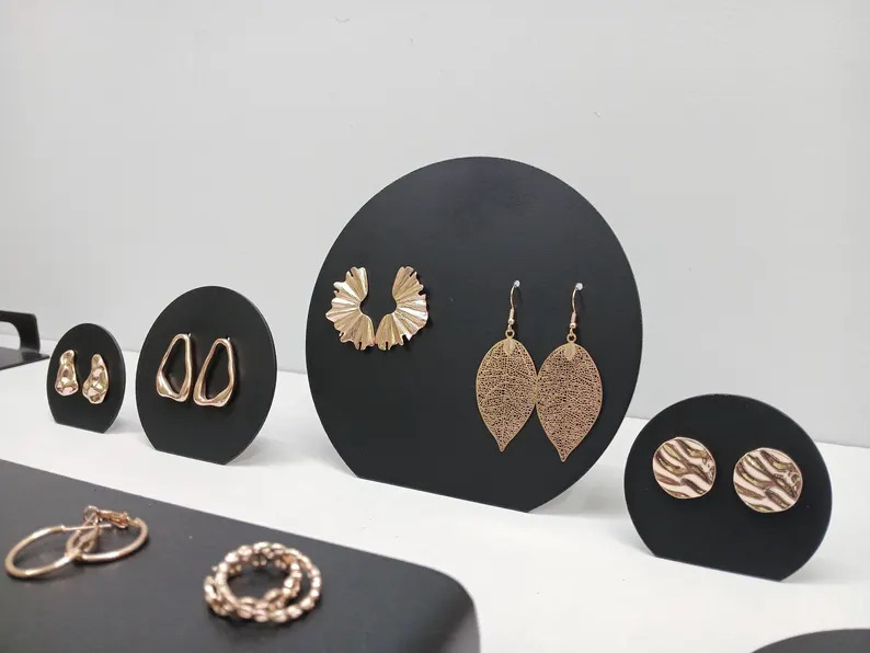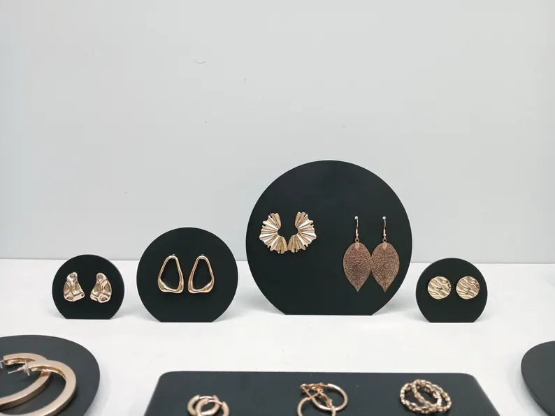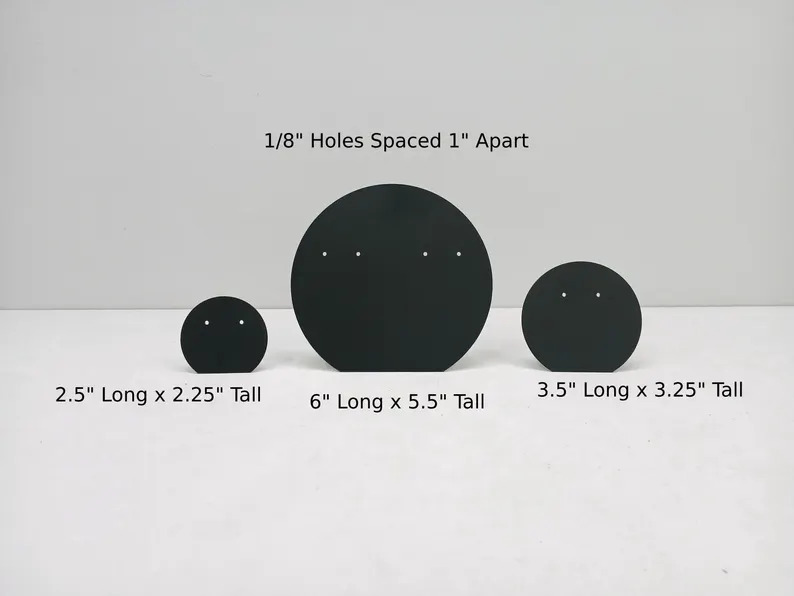 • پایه‌های دایره‌ای گوشواره: در ابعاد متنوع (مانند 2.5، 3.5 و 6 اینچ طول) با سوراخ‌های دقیق و استاندارد، برای نمایش جفتی انواع گوشواره‌های میخی و آویز طراحی شده‌اند.