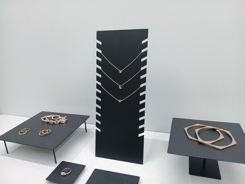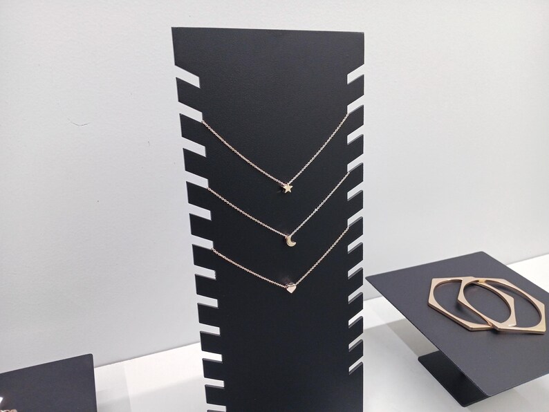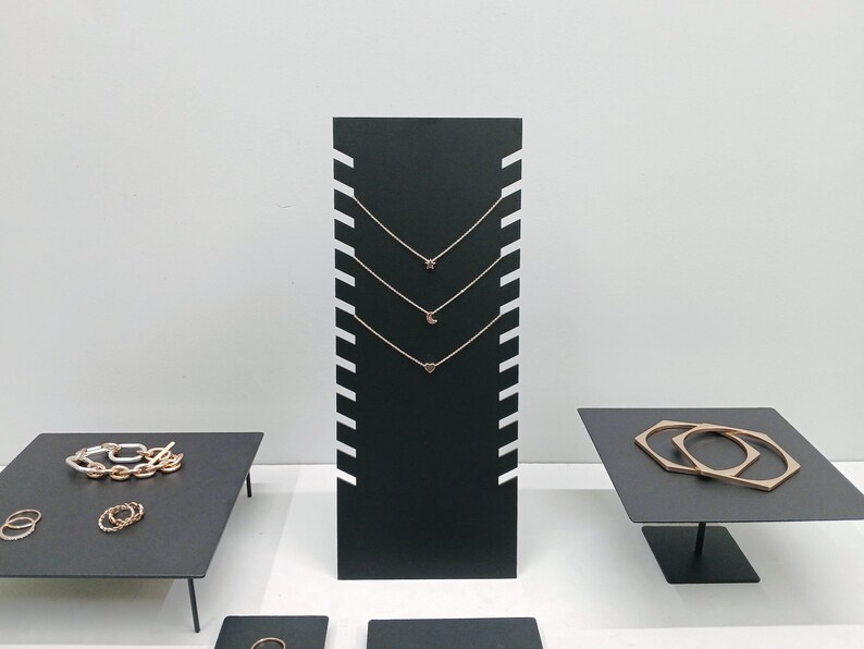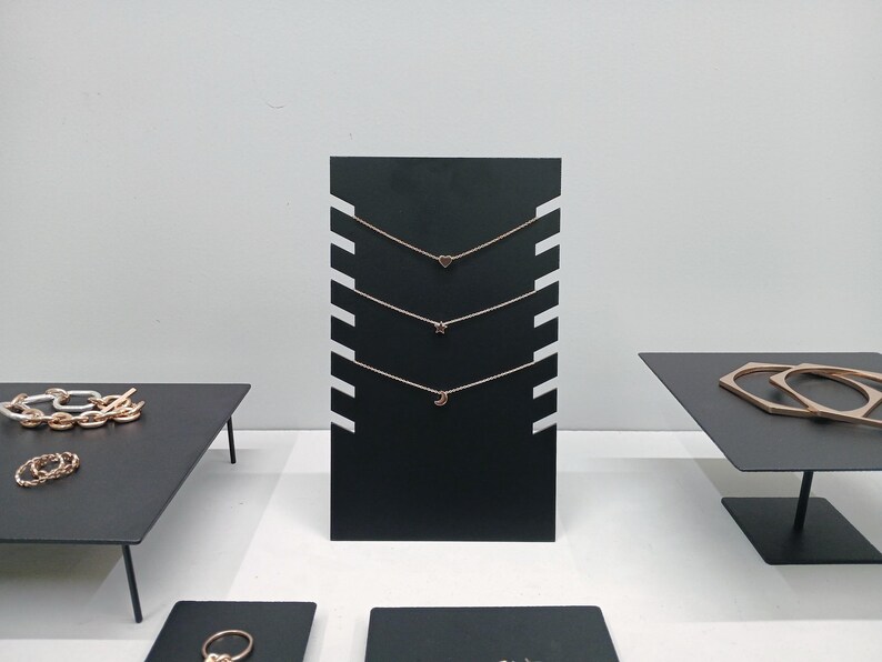 • فرم ایستاده و باریک این استند (که در تصاویر مشهود است)، فضای کمی از ویترین را اشغال کرده و امکان چینش لایه‌ای (Layering) گردنبندها را در ارتفاع‌های مختلف فراهم می‌سازد.