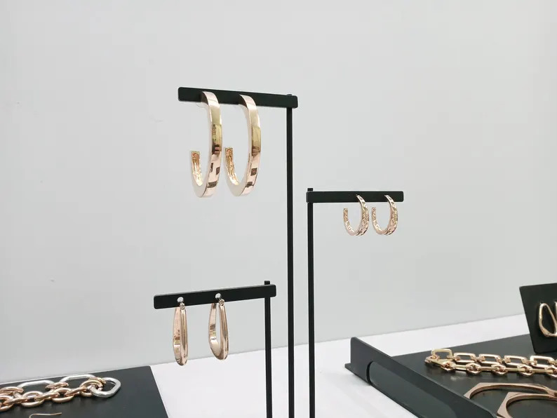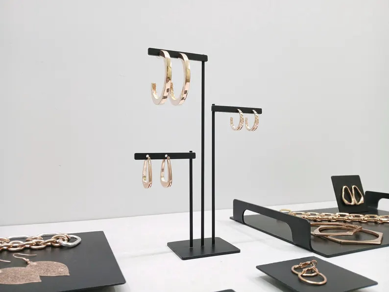 این مدل استند فلزی (مشابه تصاویر دارای گوشواره)، راهکاری عالی برای نمایش تعداد زیادی گوشواره به شیوه‌ای مرتب و چشم‌نواز است: