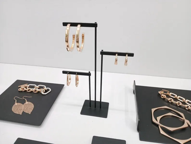 • طراحی T شکل با دو میله‌ی افقی: ساختار دو طبقه امکان نمایش منظم جفت‌های گوشواره در اندازه‌ها و مدل‌های مختلف (حلقه‌ای، آویز و میخی) را در یک فضای عمودی بهینه فراهم می‌کند.